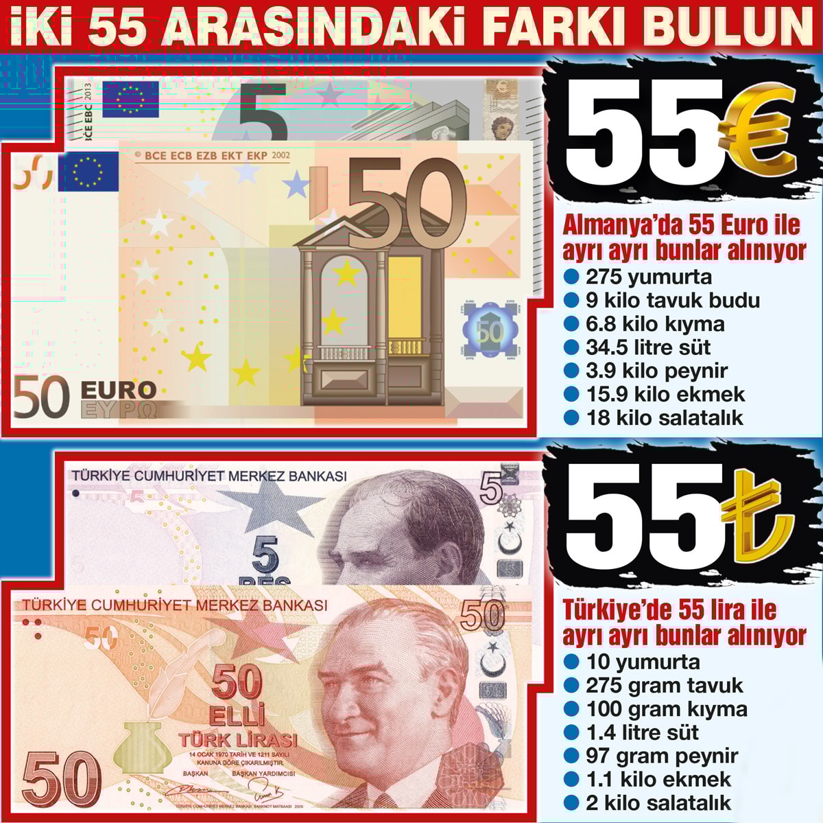 Bir tiryaki Almanya’da 55 Euro ile 11 paket sigara alabiliyorken, Türkiye’de ise 55 TL’ye sigara alabilmek için market market gezmek gerekiyor. Almanya’da 13.95 Euro olan 1 kilogram beyaz peynirden 55 Euro ile 3.9 kilogram peynir alınabilirken, Türkiye’de ise kilogramı 567.52 TL olan beyaz peynirden 55 liraya yaklaşık 2 dilime denk gelen 96.9 gram peynir alınabiliyor. Almanya’da asgari ücret olan 2.054 Euro maaş alan Hans, Berlin’de bir markette 55 Euro ile 275 adet yumurta alabiliyor. İstanbul’da ise asgari ücret ile çalışan Mehmet’in 55 lirası sadece 10 adet yumurta satın almaya yetiyor. Aynı şekilde Berlin’de bu para ile 9 kilogram kemiksiz tavuk eti almak mümkün, İstanbul’da ise tavuk bonfilenin kilogram fiyatı 200 lirayı buluyor. 55 lira ile sadece 275 gram tavuk bonfile market sepetine atılabiliyor. Berlin’de 55 Euro ile 34.5 litre yarım yağlı süt alınabilirken, İstanbul’da ise 55 lira yalnızca bir litre süte karşılık geliyor. 55 Euro ile Almanya’da 6.8 kilogram kıyma ve 18 kilogram salatalık alınırken; Türkiye’de ise 55 TL, 100 gram kıyma veya 2 kilogram salatalığa denk geliyor.